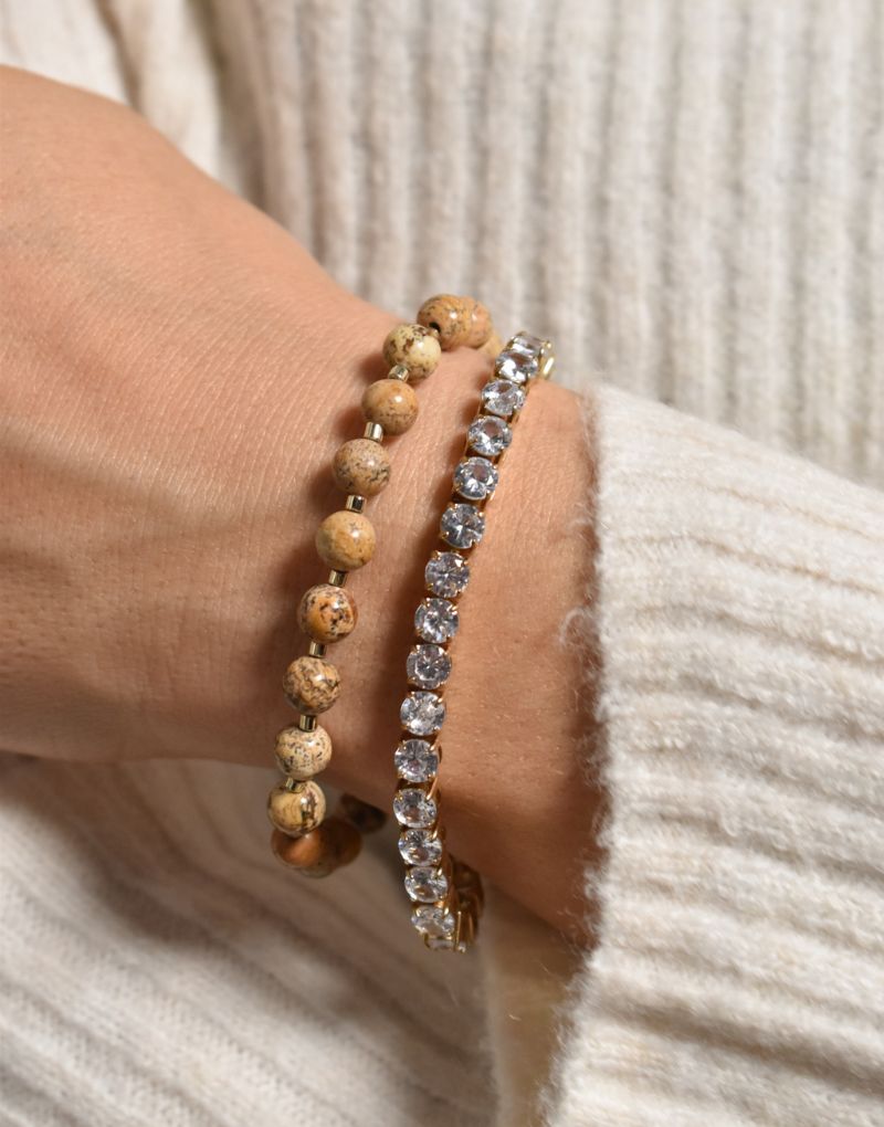 Stay is a bracelet made of genuine stone with small metal accents in between. This jasper stone evokes a sense of nature and has a wooden-like texture with its veining. The colors range from light sand to terracotta. The bracelet is on an elastic band, making it suitable for most wrist sizes. This stone is also available in a smaller size, which looks great when mixed with this bracelet.