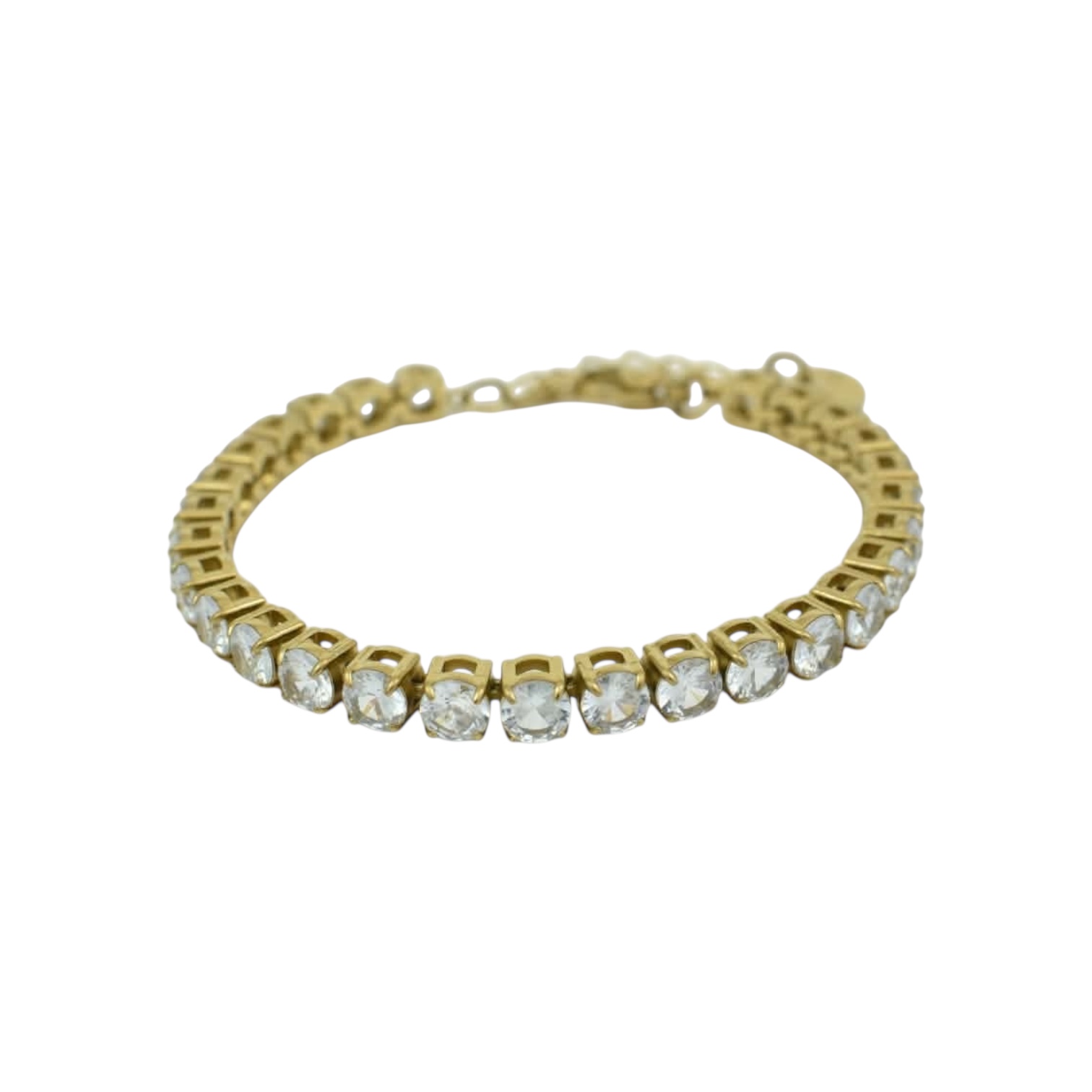 Tennisarmband i rostfritt stål pläterat med äkta guld och slipade kristaller. Försett med 3 cm extender för justerbar passform.