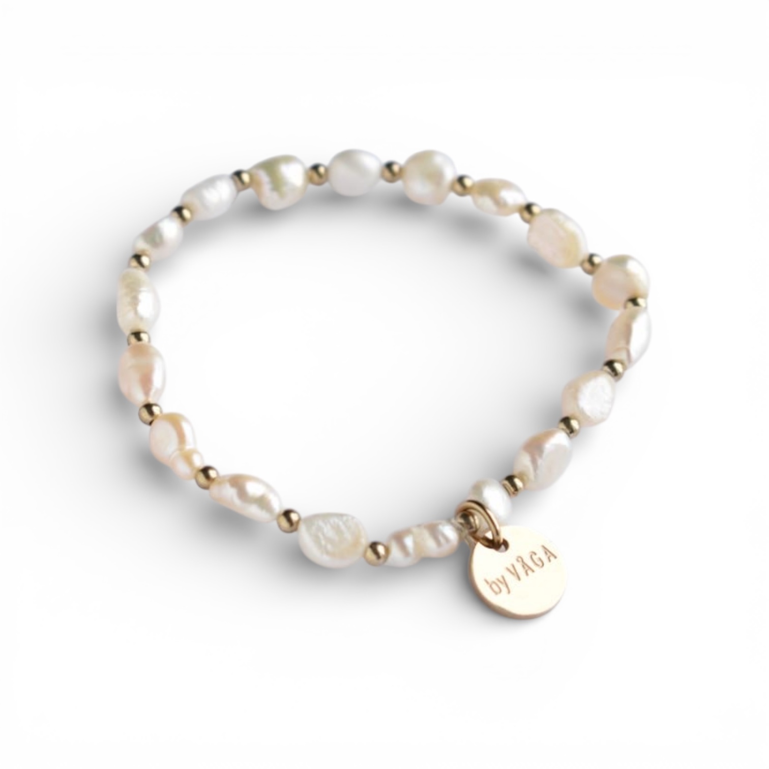 Armband med sötvattenspärlor och stålkulor emellan, pläterade med äkta guld. En klassisk detalj med mjuk lyster och tydlig form.